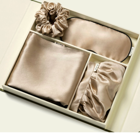 Seidiges Schlaf-Geschenkset (Seidencharmeuse, Seidenschlafmaske, Haargummi und Kissenbezug) im Wert von 147€